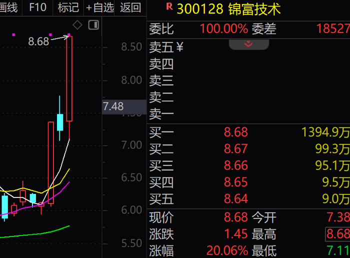 10月28日,锦富技术收获“20cm”涨停,截至当日收盘,报8.68元/股。