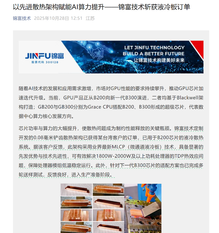 锦富技术于10月28日午间12:51在官方微信发布消息,公司定制开发的0.08毫米铲齿散热架构已获得某客户的订单,已用于B200芯片的液冷散热系统。据该客户反馈,此架构采用业界最新MLCP(微通道液冷板)技术,具备显著的先发优势与技术先进性,可有效解决1800W-2000W及以上功耗处理器的TDP热效应问题,保障处理器模组低温稳定运行。此外,针对下一代B300芯片的适配方案也已完成多轮送样测试,反馈良好,进入生产准备阶段。