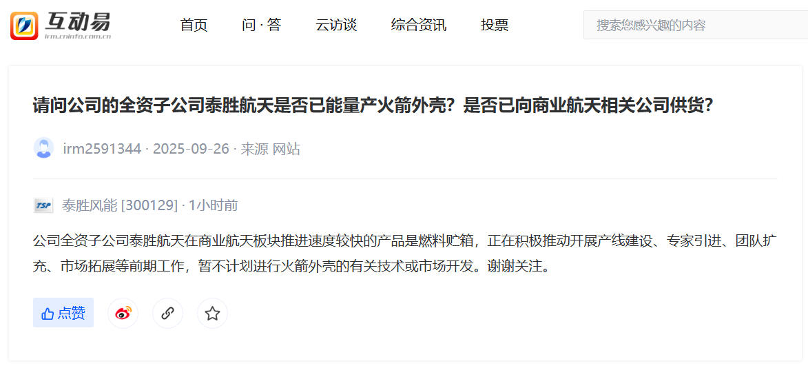 泰胜风能:暂不开展火箭外壳相关技术或市场开发
