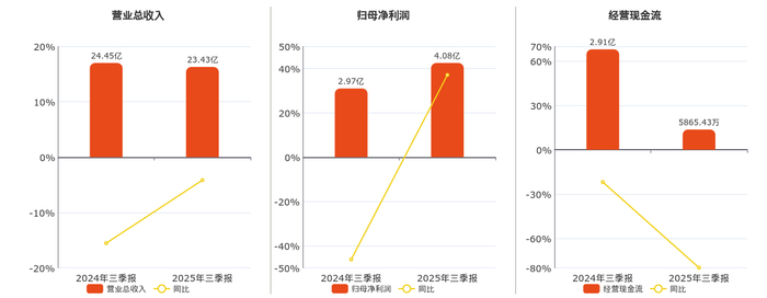 公司营业总收入为23.43亿元,较去年同报告期营业总收入减少1.02亿元,同比较去年同期下降4.15%。归母净利润为4.08亿元。经营活动现金净流入为5865.43万元,较去年同报告期经营活动现金净流入减少2.33亿元,同比较去年同期下降79.86%。
