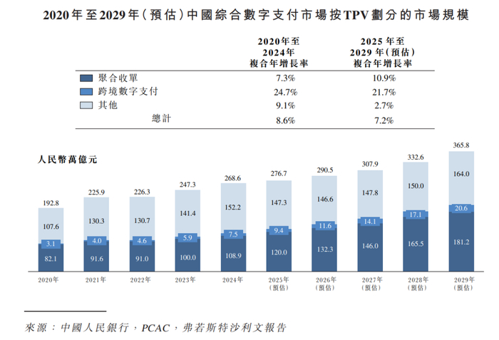 根据弗若斯特沙利文(Frost & Sullivan)的资料,近年来,数字支付工具日益普及并融入更广泛的支付场景,推动了综合数字支付市场的增长,而消费场景的多元化预计将进一步驱动市场扩张。中国综合数字支付市场的TPV从2020年的人民币192.8万亿元增长至2024年的人民币268.6万亿元,复合年增长率达8.6%,而预计到2029年将达到人民币365.8万亿元,2025年至2029年复合年增长率将达7.2%。