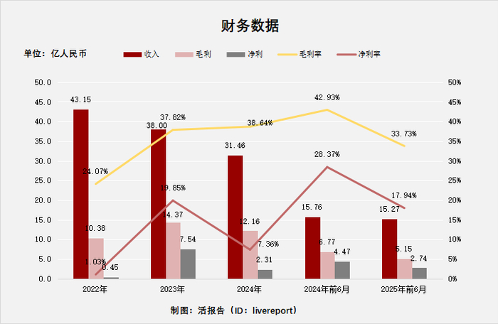 收入分别约为人民币43.15亿元、38亿元、31.46亿元、15.76亿元及15.27亿元,年复合增长率为-14.62%;
