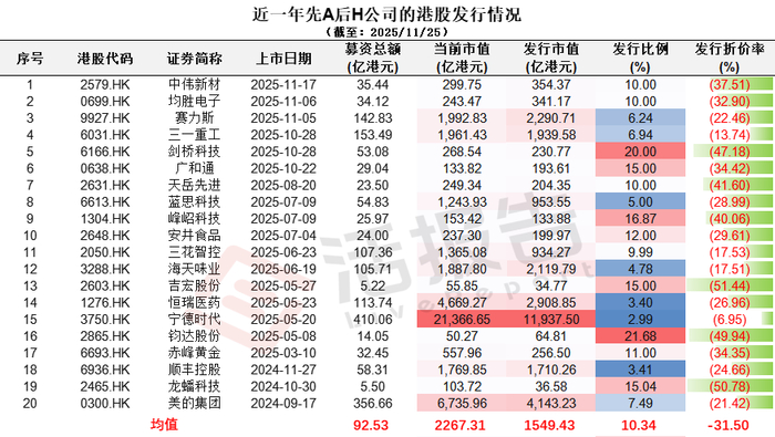 截至2025年11月25日,近一年成功赴港上市的A股公司合计20家,平均发行折价率约为31.50%。