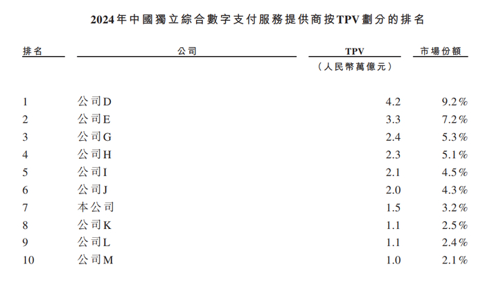 根据弗若斯特沙利文(Frost & Sullivan)的资料,2024年中国独立综合数字支付服务提供商贡献的综合数字支付服务市场的TPV为人民币45.7万亿元。公司2024年TPV于中国独立综合数字支付服务提供商中就TPV排名第7位,市场份额为3.2%。