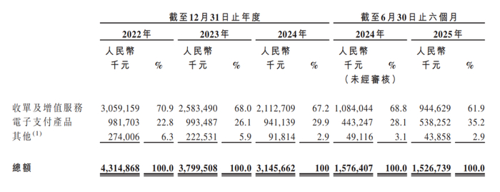 来源:招股书公司的收入主要来自:(i)收单及增值服务,(ii)销售电子支付产品,及(iii)其他。