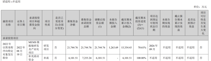 根据原定计划,“MEMS微振镜研发及产业化项目”预计于2025年2月达到可使用状态。但截至2024年年底,距预定日期仅剩两个月时,该项目的投资进度为64.8%,进展相对滞后。