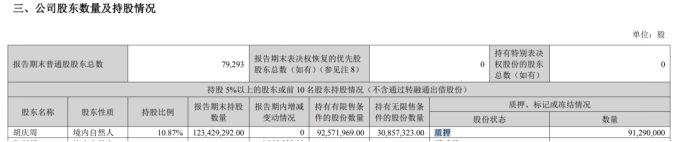 截至2025年6月末,胡庆周共持有英唐智控1.24亿股股份,持股比例为10.87%。其中处于质押状态的股份为9129万股,占公司总股本的8.04%,占其持有公司股份的73.96%。