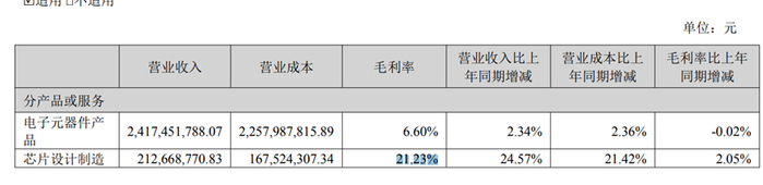 2025年半年报显示,受行业竞争加剧等因素影响,产业链各环节产品利润空间普遍受到挤压,公司支柱业务的毛利率随之下滑至6.6%。同期,公司芯片制造业务的毛利率则为21.23%,远高于电子元器件分销业务。