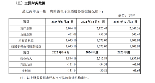 另一标的公司奥简微电子尚未实现盈利。2023年、2024年及2025年1-8月,奥简微电子的营业收入分别为1837.99万元、2712.84万元、1844.19万元;净利润分别为-65.65万元、-30.86万元、-151.14万元,持续为负。如何有效盘活与整合这项亏损资产,亦是外界关注的重点。