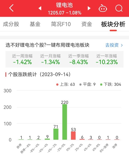 中国经济网北京9月14日讯今日,锂电池板块整体跌幅1.08%,其中63只股票上涨,9只股票平盘,304只股票下跌。