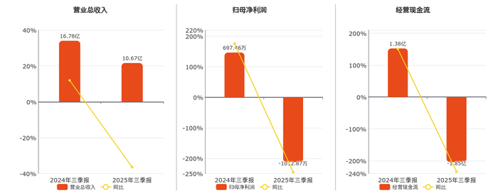 公司营业总收入为10.67亿元,较去年同报告期营业总收入减少6.11亿元,同比较去年同期下降36.42%。归母净利润为-1012.87万元,较去年同报告期归母净利润减少1710.34万元,同比较去年同期下降245.22%。经营活动现金净流入为-1.85亿元,较去年同报告期经营活动现金净流入减少3.23亿元,同比较去年同期下降234.00%。