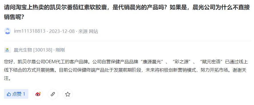 晨光生物(300138)在互动平台上表示,凯贝尔是公司OEM代工的客户品牌。公司自营保健产品品牌“康源晨光”“彩之源”“赋元密语”已通过线上线下结合的方式开展销售。目前公司保健终端产品处于发展前期阶段,未来将积极创新营销模式,努力开拓市场。