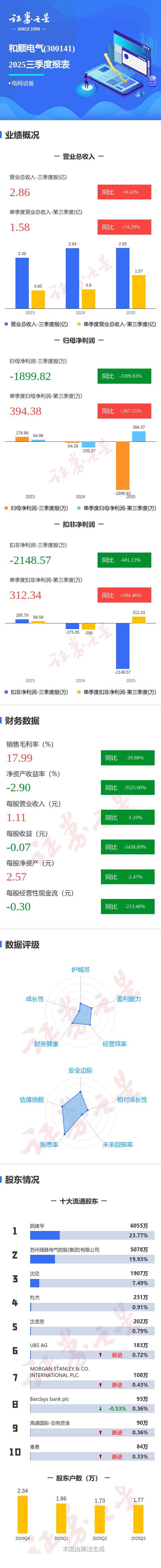 证券之星消息,和顺电气2025年三季报显示,公司主营收入2.86亿元,同比上升0.44%;归母净利润-1899.82万元,同比下降3399.84%;扣非净利润-2148.57万元,同比下降681.13%;其中2025年第三季度,公司单季度主营收入1.58亿元,同比上升74.29%;单季度归母净利润394.38万元,同比上升267.55%;单季度扣非净利润312.34万元,同比上升204.46%;负债率38.6%,投资收益225.67万元,财务费用161.33万元,毛利率17.99%。