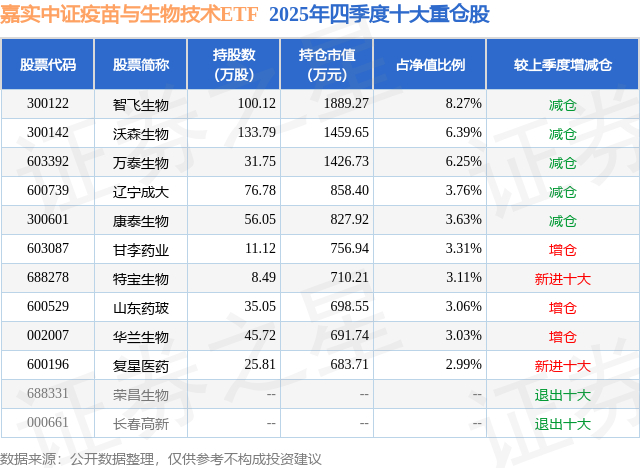 根据2025基金年报公募基金重仓股数据,重仓该股的公募基金共7家,其中持有数量最多的公募基金为嘉实基金的嘉实中证疫苗与生物技术ETF。嘉实中证疫苗与生物技术ETF目前规模为2.28亿元,最新净值0.7193(1月23日),较上一交易日上涨1.77%,近一年上涨13.79%。该公募基金现任基金经理为周泉希。周泉希在任的基金产品包括:嘉实中证芯片产业指数发起式A,管理时间为2025年12月6日至今,期间收益率为21.55%。