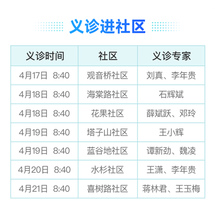2023年4月15日至21日,锦江区癌症防治中心·四川友谊医院将在锦江区七个社区组织开展2023年全国肿瘤防治宣传周(锦江站)“携手社区 服务百姓”义诊活动。友谊医院主任医师、副主任医师带队坐诊各大社区,为辖区内居民免费提供诊疗、免费测血压、免费测血糖,肿瘤相关疾病健康教育、常见病的健康指导及预防等健康指导。