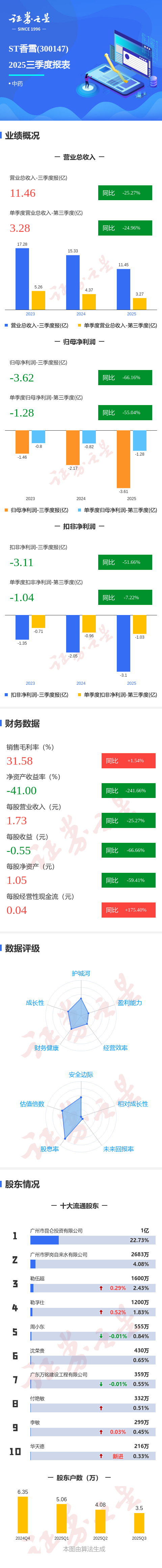 图解ST香雪三季报:第三季度单季净利润同比下降55.04%
