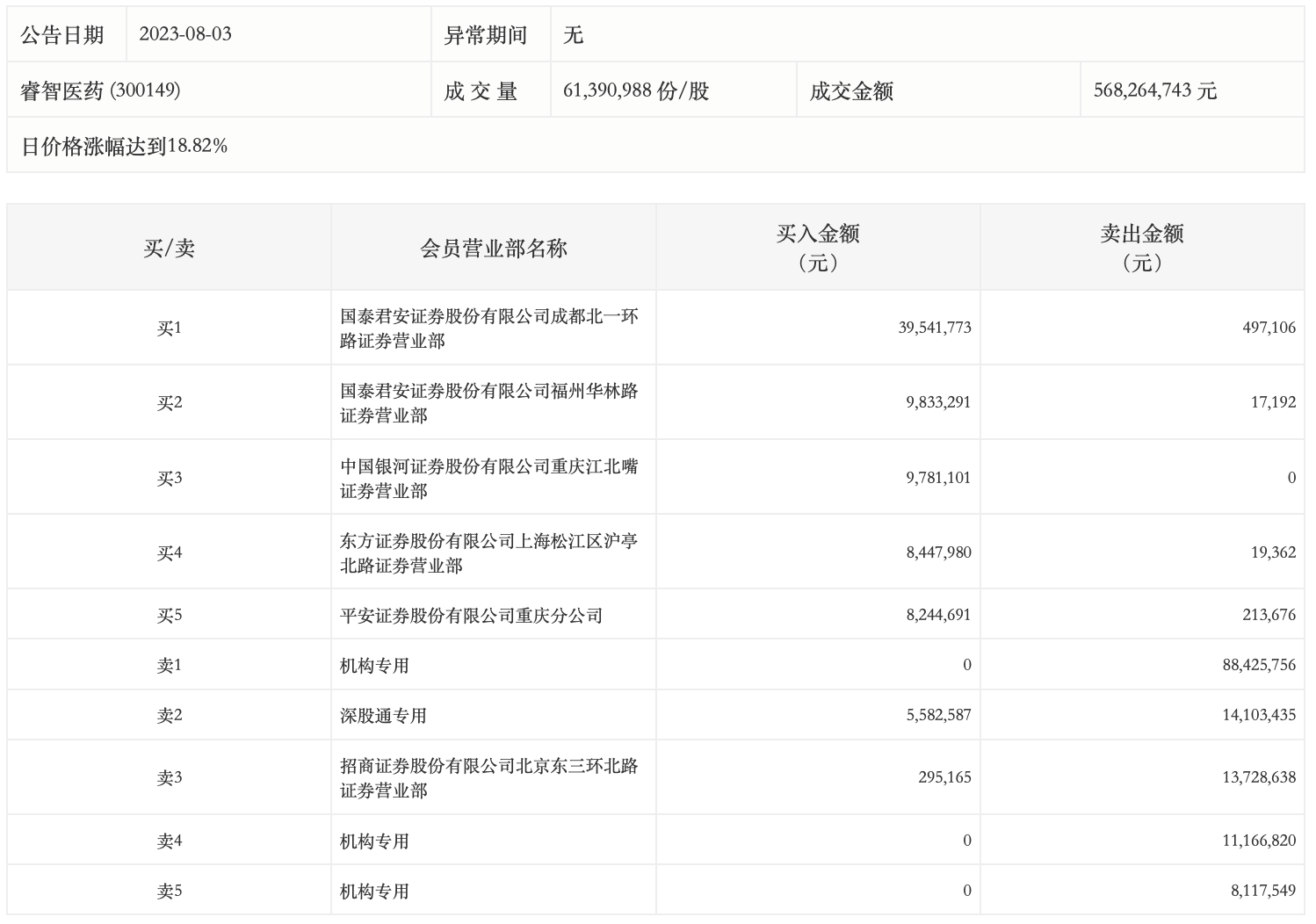 8月3日,睿智医药今日涨18.82%,龙虎榜数据显示,上榜营业部席位全天成交2.18亿元,占当日总成交金额比例为38.37%。其中,买入金额为8172.66万元,卖出金额为1.36亿元,合计净卖出5456.29万元。