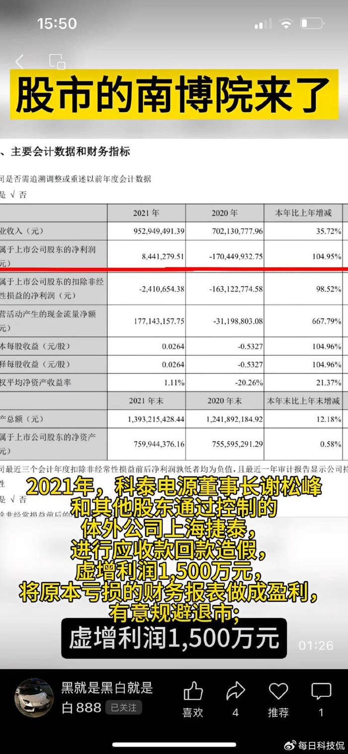 根据发布者的举报,科泰电源董事长谢松峰及其股东通过控制的体外公司上海捷泰,在2021年进行了严重的财务造假,虚构应收款回款,制造了1,500万元的虚假利润。这一行为直接影响了公司的财务报表,使得原本亏损的财报被篡改为盈利,从而实现了规避退市的目的。通过这一操作,谢松峰及其核心股东不仅让公司财务状况看似良好,还借此机会在股市上进行高位减持,套现金额超过8,000万元。