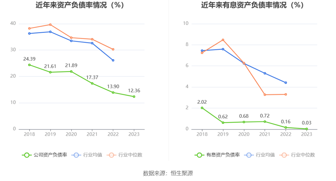 在偿债能力方面,公司2023年年末资产负债率为12.36%,相比上年末下降1.54个百分点;有息资产负债率为0.03%,相比上年末下降0.13个百分点。