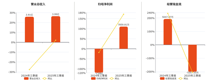 公司营业总收入为3.99亿元。归母净利润为7859.81万元。经营活动现金净流入为-5357.55万元,较去年同报告期经营活动现金净流入减少1.04亿元,同比较去年同期下降206.15%。