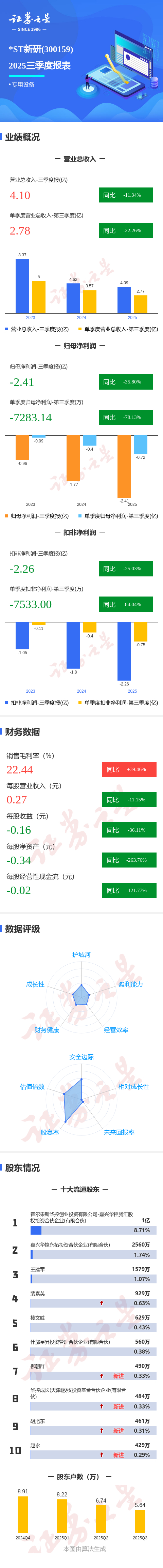 图解*ST新研三季报:第三季度单季净利润同比下降78.14%