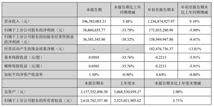 其中第三季度,秀强股份营业收入为3.97亿元,同比增长5.48%;归母净利润为3886.07万元,同比下降35.78%;扣非归母净利润为3638.53万元,同比下降38.32%;基本每股收益0.05元。