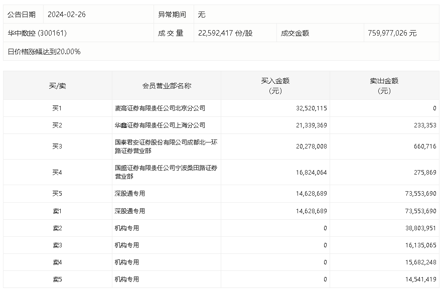 2月26日,华中数控今日涨停,龙虎榜数据显示,上榜营业部席位全天成交2.65亿元,占当日总成交金额比例为34.93%。其中,买入金额为1.06亿元,卖出金额为1.6亿元,合计净卖出5429.61万元。