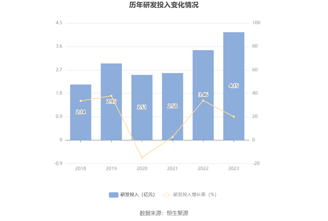2023年全年,公司研发投入金额为4.15亿元,同比增长20.08%;研发投入占营业收入比例为19.63%,相比上年同期下降1.16个百分点。此外,公司全年研发投入资本化率为25.84%。