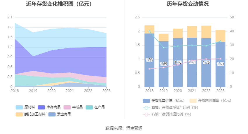 从存货变动来看,截至2023年年末,公司存货账面价值为1.63亿元,占净资产的32.9%,较上年末减少1360.59万元。其中,存货跌价准备为4163.08万元,计提比例为20.38%。