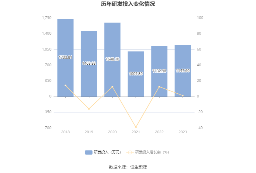 2023年全年,公司研发投入金额为1147.60万元,同比增长1.29%;研发投入占营业收入比例为4.55%,相比上年同期上升0.83个百分点。此外,公司全年研发投入资本化率为0。
