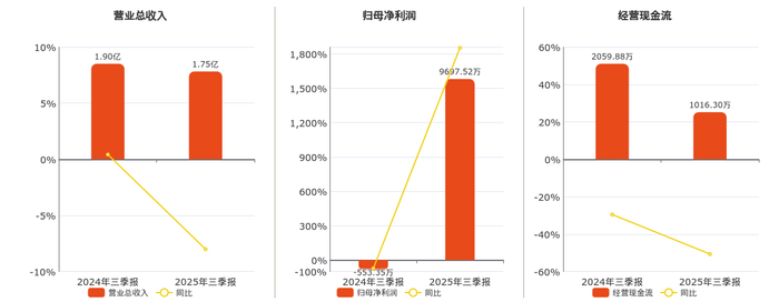 公司营业总收入为1.75亿元,较去年同报告期营业总收入减少1524.36万元,同比较去年同期下降8.01%。归母净利润为9697.52万元。经营活动现金净流入为1016.30万元,较去年同报告期经营活动现金净流入减少1043.58万元,同比较去年同期下降50.66%。