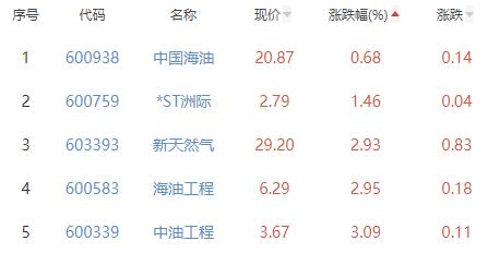 中国海油、*ST洲际、新天然气、海油工程、中油工程位列涨幅榜后五位,涨幅分别为0.68%、1.46%、2.93%、2.95%、3.09%。