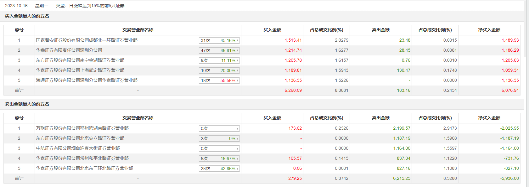 10月16日,通源石油今日涨停,全天换手率达24.75%,振幅达17.11%。龙虎榜数据显示,营业部席位合计净买入140.93万元。其中,国泰君安证券成都北一环路证券营业部、华鑫证券深圳分公司分别买入1513.41万元、1214.74万元;万联证券鄂州滨湖南路证券营业部、东方证券北京安立路证券营业部分别卖出2199.57万元、1187.19万元。