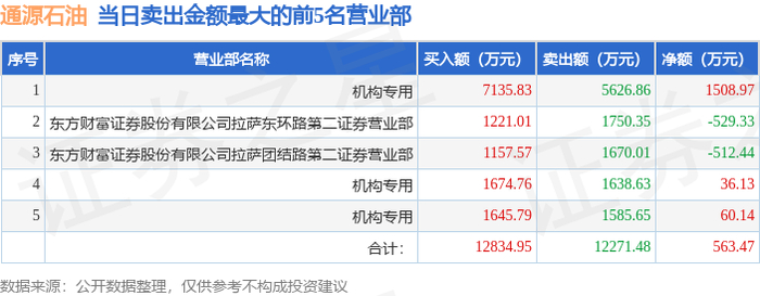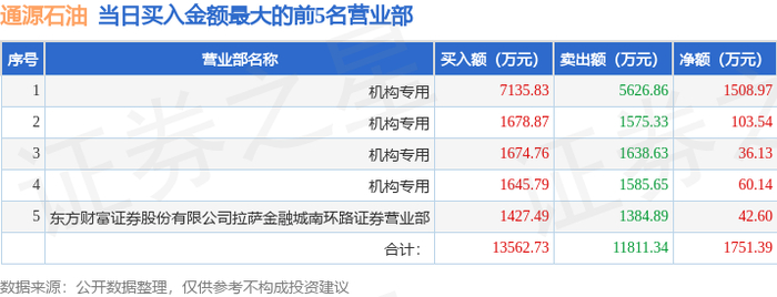10月22日通源石油(300164)龙虎榜数据:机构净买入1708.79万元