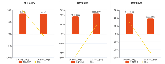 公司营业总收入为8.60亿元,较去年同报告期营业总收入减少712.63万元,同比较去年同期下降0.82%。归母净利润为5622.24万元。经营活动现金净流入为5383.66万元,较去年同报告期经营活动现金净流入减少1712.40万元,同比较去年同期下降24.13%。