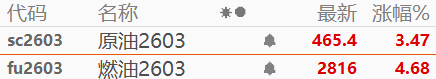 国内期货表现方面,燃油期货主力合约涨超4%,报2816元/吨,原油期货主力合约涨超3%,报465.4元/桶。