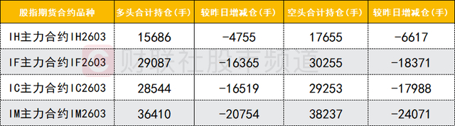 四大期指主力合约中,IH、IF、IC、IM合约多空双方均减仓,IH、IM合约空头减仓数量较多。