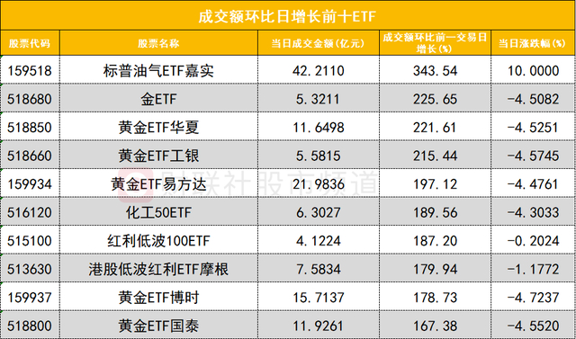 从成交额环比增长前十的ETF来看,标普油气ETF嘉实(159518)成交额环比增长343%位居首位;金ETF(518680)成交额环比增长225%位居次席。