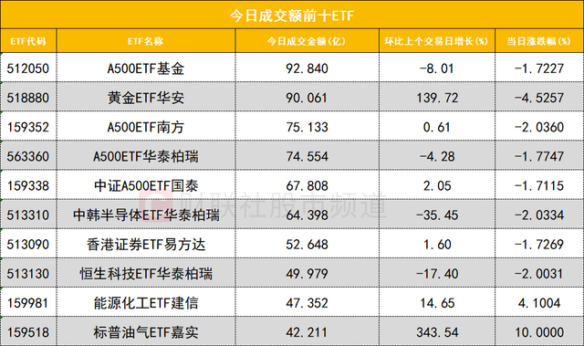 从成交额前十的ETF来看,A500ETF基金(512050)成交额位居首位,黄金ETF华安(518880)成交额位居次席。