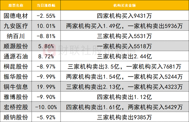 今日龙虎榜机构活跃度有所提升,通源石油逆势走强,却遭三家机构卖出2.44亿。2连板的九安医疗获两家机构买入1.49亿,同时遭一家机构卖出5936万。