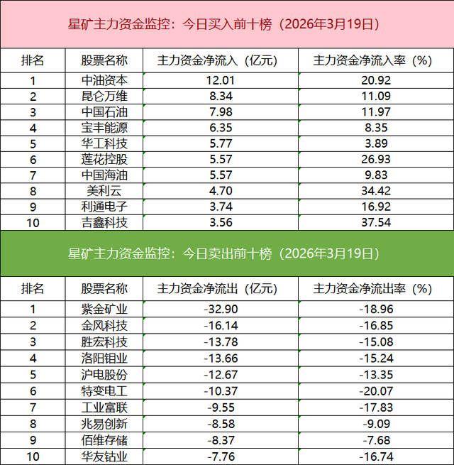 主力资金流出前十的个股所属板块较为分散,紫金矿业净流出居首。