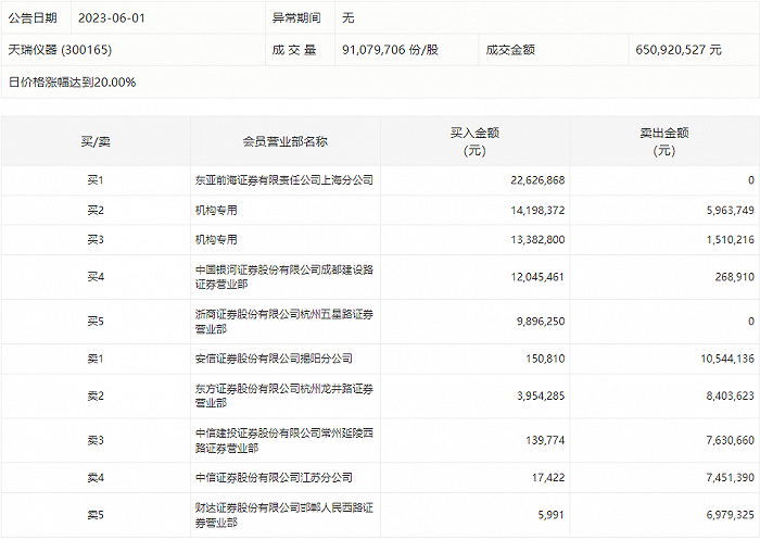 6月1日,天瑞仪器今日涨停,龙虎榜数据显示,上榜营业部席位全天成交1.25亿元,占当日总成交金额比例为19.23%。其中,买入金额为7641.8万元,卖出金额为4875.2万元,合计净买入2766.6万元。