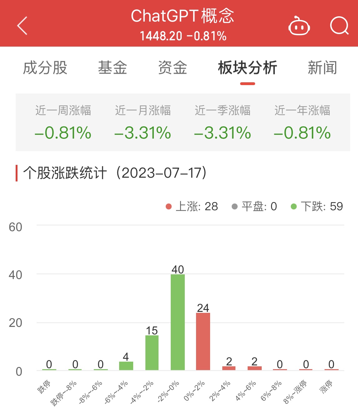 中国经济网北京7月17日讯今日,ChatGPT概念板块整体涨幅-0.81%,其中28只股票上涨,0只股票平盘,59只股票下跌。