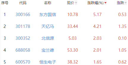 其中,东方国信、天亿马、北信源、宝兰德和恒生电子位列板块涨幅前五位,涨幅分别为5.17%、4.21%、2.03%、2.01%和1.65%。