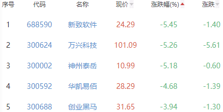 新致软件、万兴科技、神州泰岳、华凯易佰和创业黑马位列涨幅榜后五位,涨幅分别为-5.45%、-5.26%、-5.18%、-4.68%和-3.94%。