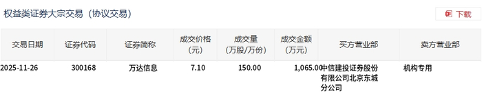 11月26日,万达信息大宗交易成交150万股,成交额1065万元,占当日总成交额的5.36%,成交价7.1元,较市场收盘价7.14元折价0.56%。
