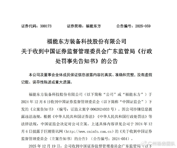 2025年12月19日晚间,福能东方装备科技股份有限公司(公司或福能东方)披露,收到广东证监局下发的《行政处罚事先告知书》。