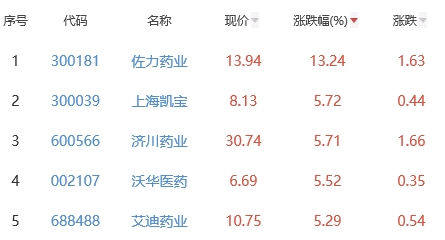 其中,佐力药业、上海凯宝、济川药业、沃华医药、艾迪药业位列板块涨幅前五位,涨幅分别为13.24%、5.72%、5.71%、5.52%、5.29%。