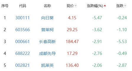 向日葵、普莱柯、长春高新、成都先导、凯莱英位列涨幅榜后五位,涨幅分别为-5.47%、-3.62%、-2.91%、-2.76%、-2.06%。