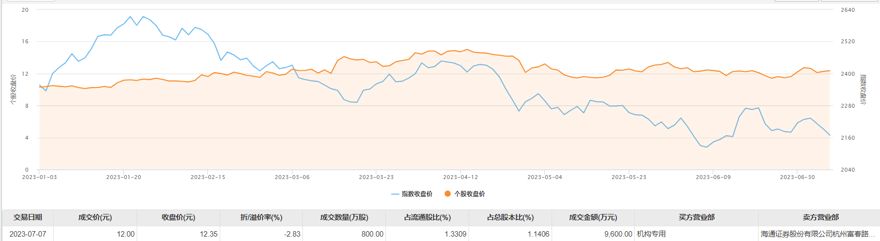 7月7日大宗交易成交800万股,成交额9600万元,占当日总成交额的28.26%,成交价12元,较市场收盘价12.35元折价2.83%。